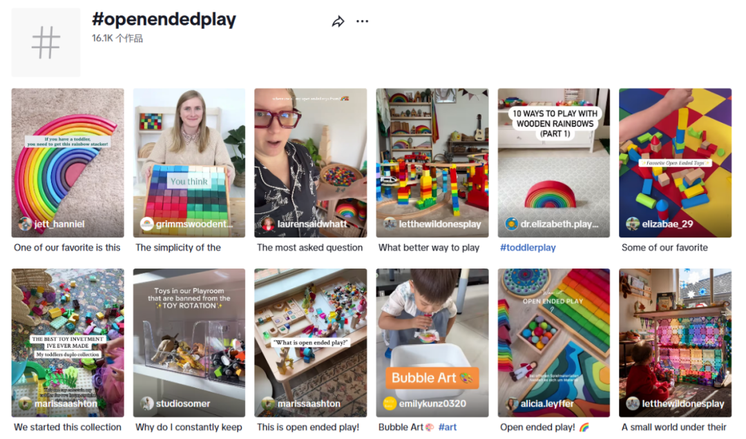 社交媒体无疑放大了这一趋势。在TikTok上,#openendedplay(开放性游戏)和 #imaginativeplay(想象力游戏) 等内容标签快速增长。相关视频通常并非生硬推销,而是巧妙将产品卖点融入生动的实景游戏中,真实展现孩子如何借助玩具自创故事、发展社交与表达能力。