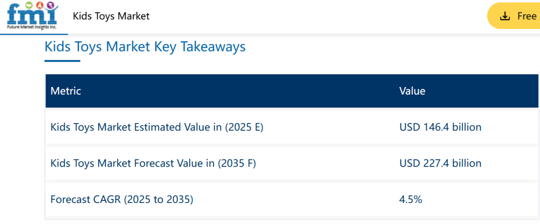据Future Market Insights预测,全球儿童玩具市场规模预计将从2025年的1464亿美元增长至2035年的2274亿美元,复合年增长率达4.5%。其中,玩偶和毛绒玩具类别表现最为突出,占据22.7%的市场份额;而从材料结构来看,塑料类玩具仍将占据主导地位,份额达63.1%。