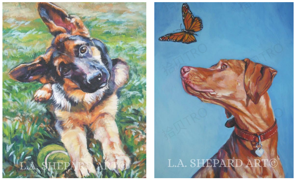 该艺术家的作品(如“德国牧羊犬幼犬与球”、“维兹拉犬与蝴蝶”等)广泛应用于家居装饰、印刷品等领域,侵权风险极高。卖家需立即排查下架所有相关图片,包括将其用于商品(如挂画、手机壳)或作为宣传素材。