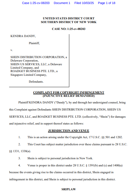 2025年10月3日,美国费城的跨学科艺术家Kendra Dandy在纽约州南区地区法院对快时尚巨头希音(Shein)提起版权侵权诉讼。这起诉讼指控希音未经授权复制、分发其受版权保护的原创作品,并要求损害赔偿和禁令救济。这并非个案,它再次将中国出海企业在全球化扩张中面临的知识产权合规风险推至聚光灯下。