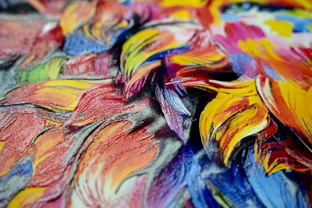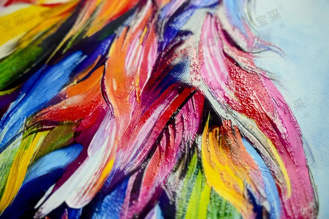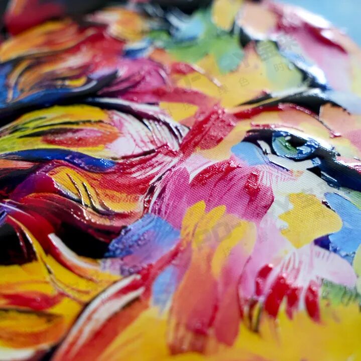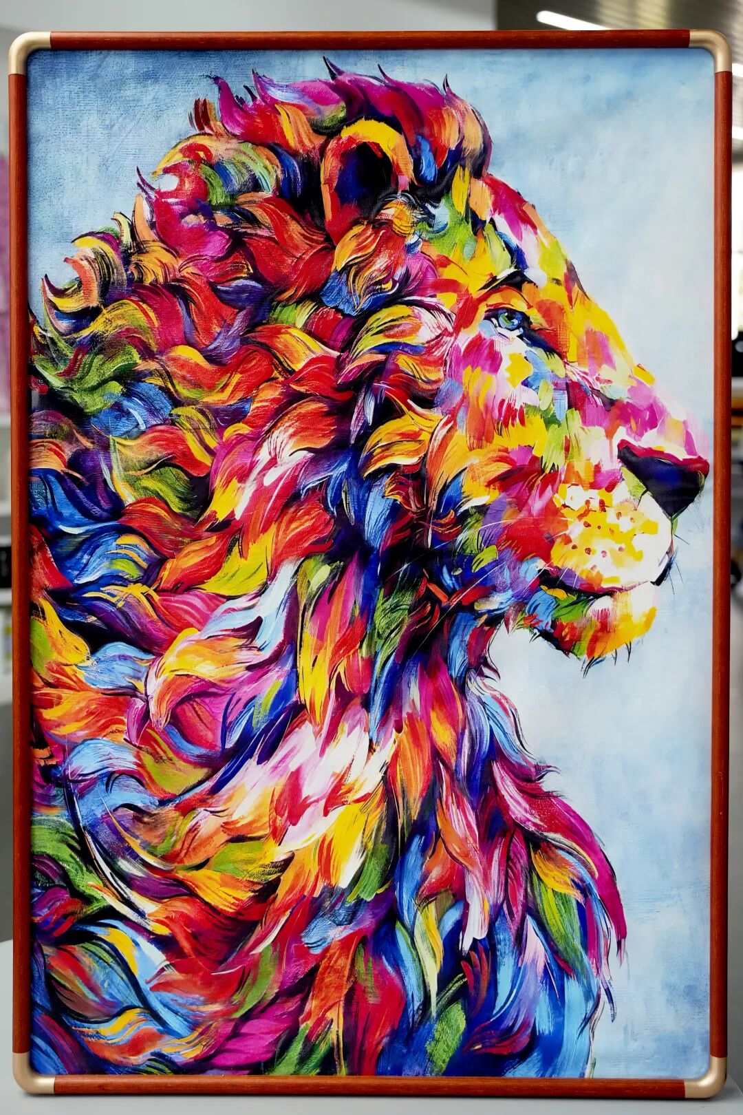 例如这幅多彩狮子UV油画,宝采UV网带机完美地将油画特有的层次感和立体感呈现出来。