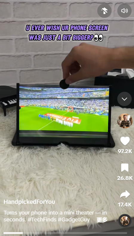 在TikTok上,能火的不一定要“新”,但一定要“能被看懂”。这款放大镜恰好具备了这一特质。只需一个简单的画面对比——手机小屏幕 vs 放大后的大屏,就能瞬间传递产品价值。