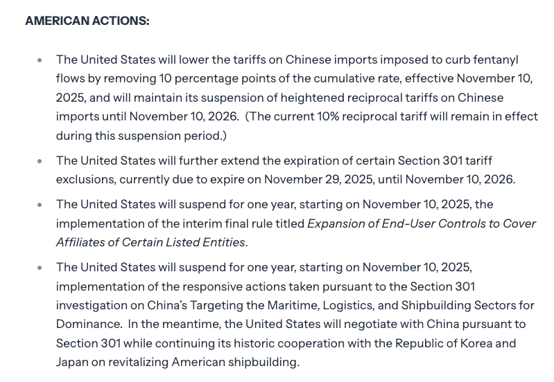 11月1日,美国政府在白宫官网正式宣布针对中国贸易政策的调整变化,包括将芬太尼关税降低10个百分点、进一步延长某些301条款关税豁免的有效期、暂停收取港口服务费等。至此,美国对中国输美商品的总体关税税率约从57%降至47%。