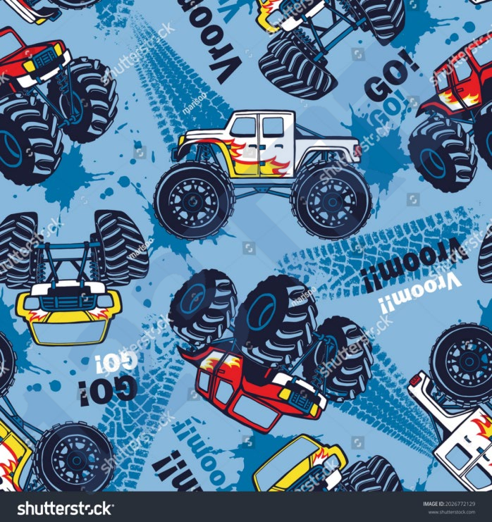 SCI SPARK 蓝底怪兽卡车平铺插画