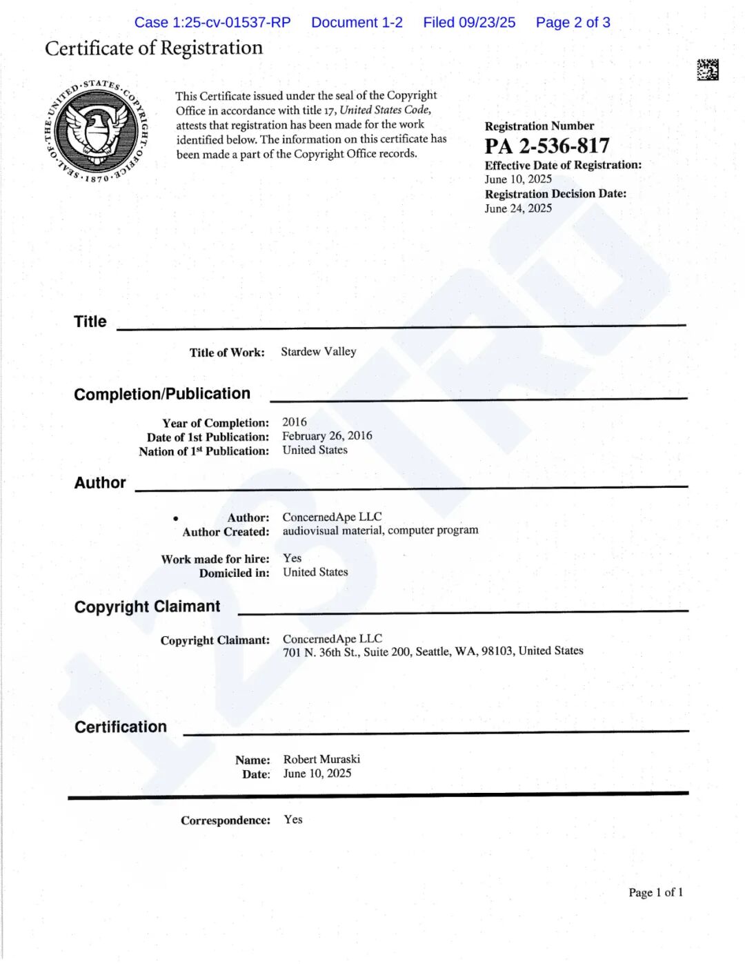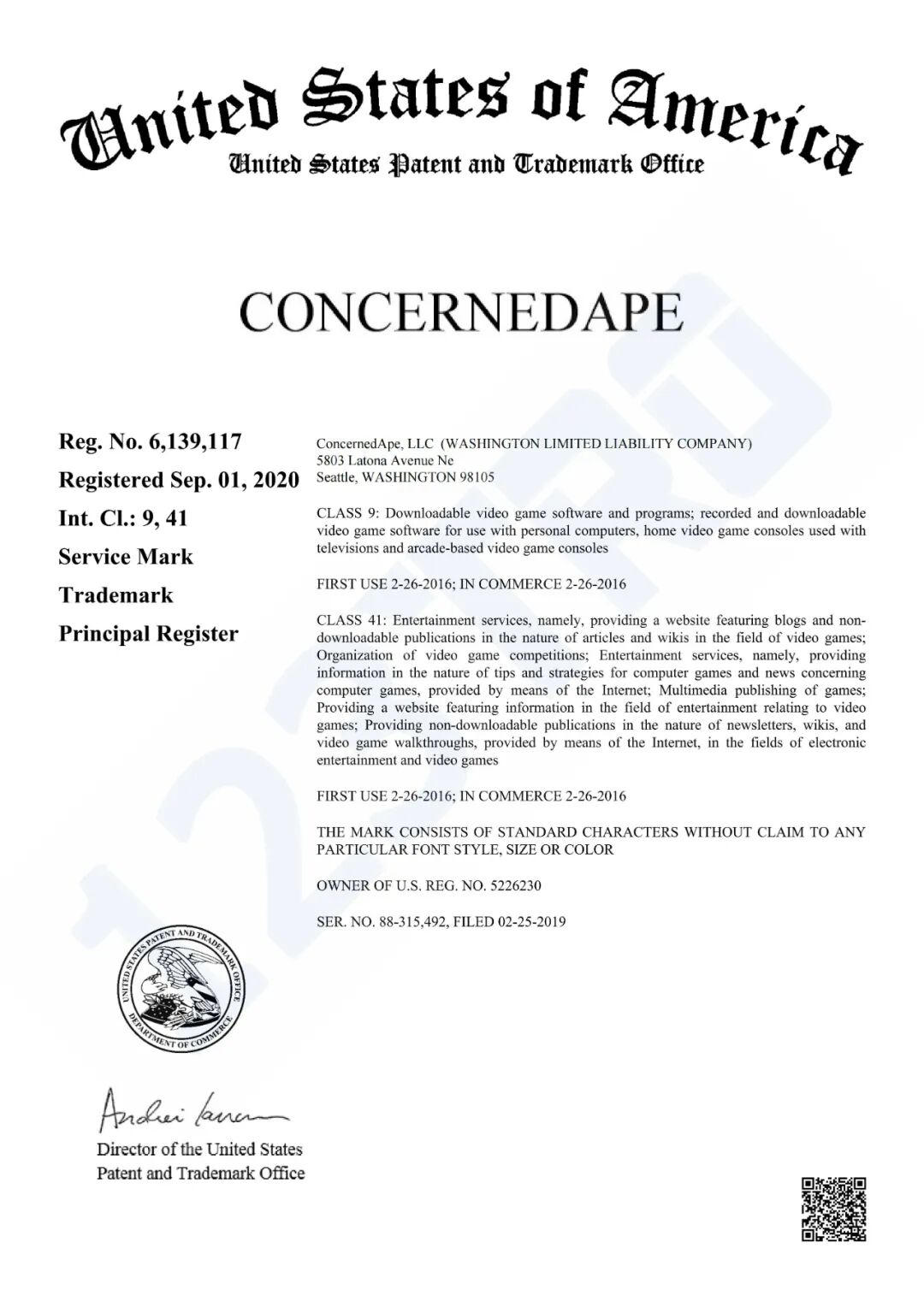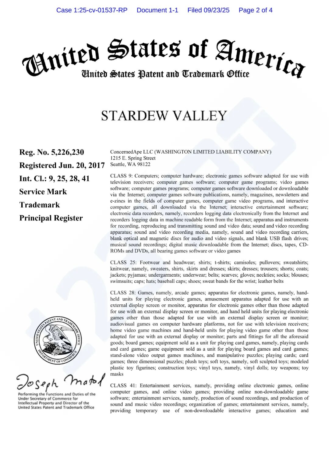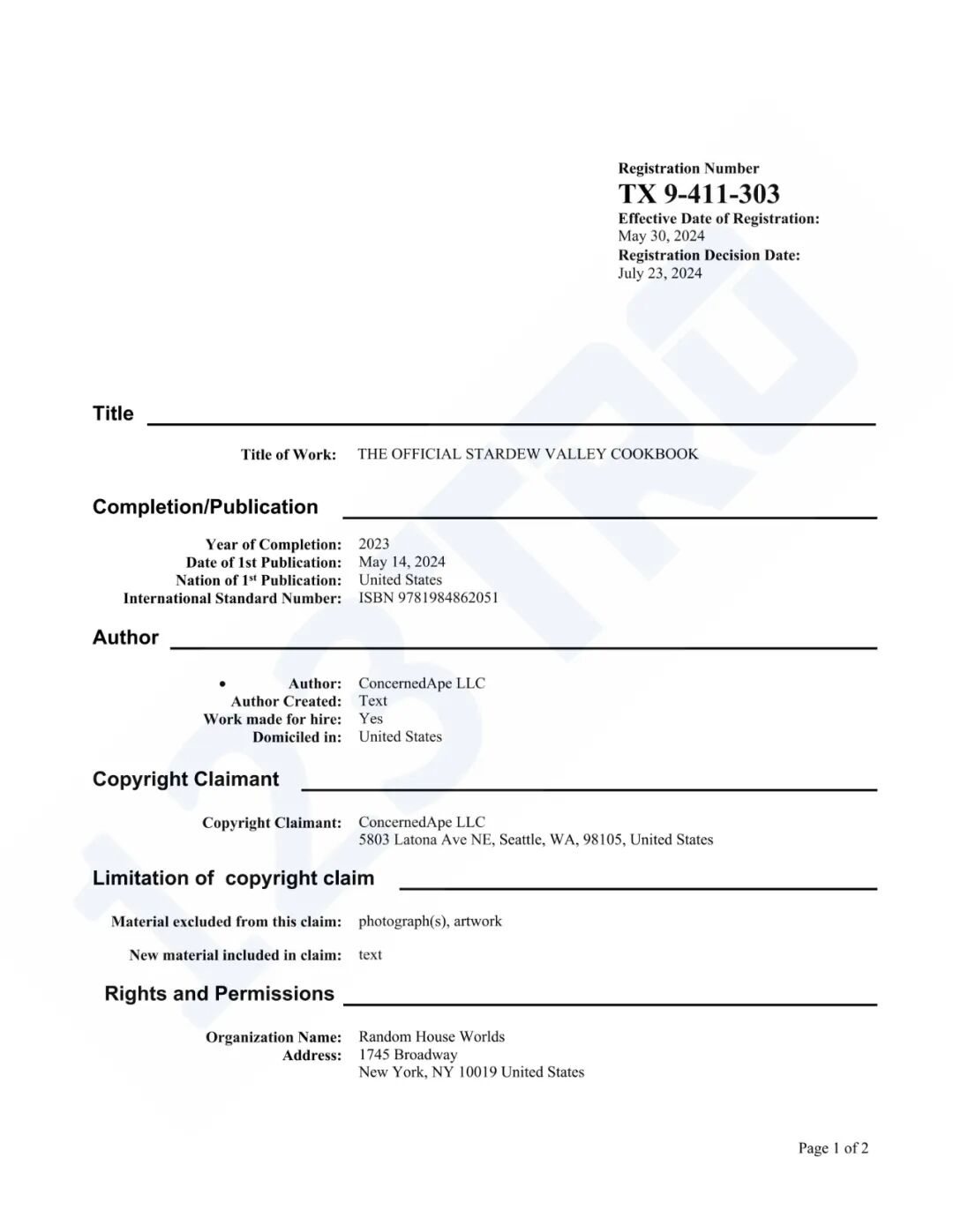 原告名下还有一条“CONCERNEDAPE”商标,以及“THE OFFICIAL STARDEW VALLEY COOKBOOK”的文字版权