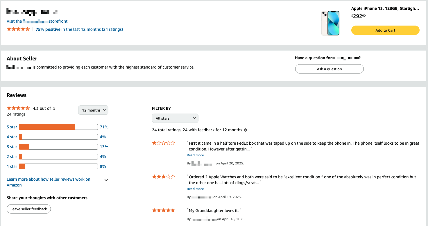 卖家回馈是消费者针对其与卖家之间的整体交易体验所提供的评价,内容通常涵盖物流速度、顾客服务态度、沟通效率等与产品本身没有直接关联的服务品质。卖家回馈并不会显示在产品页面上,而是呈现在卖家的店铺资讯中。