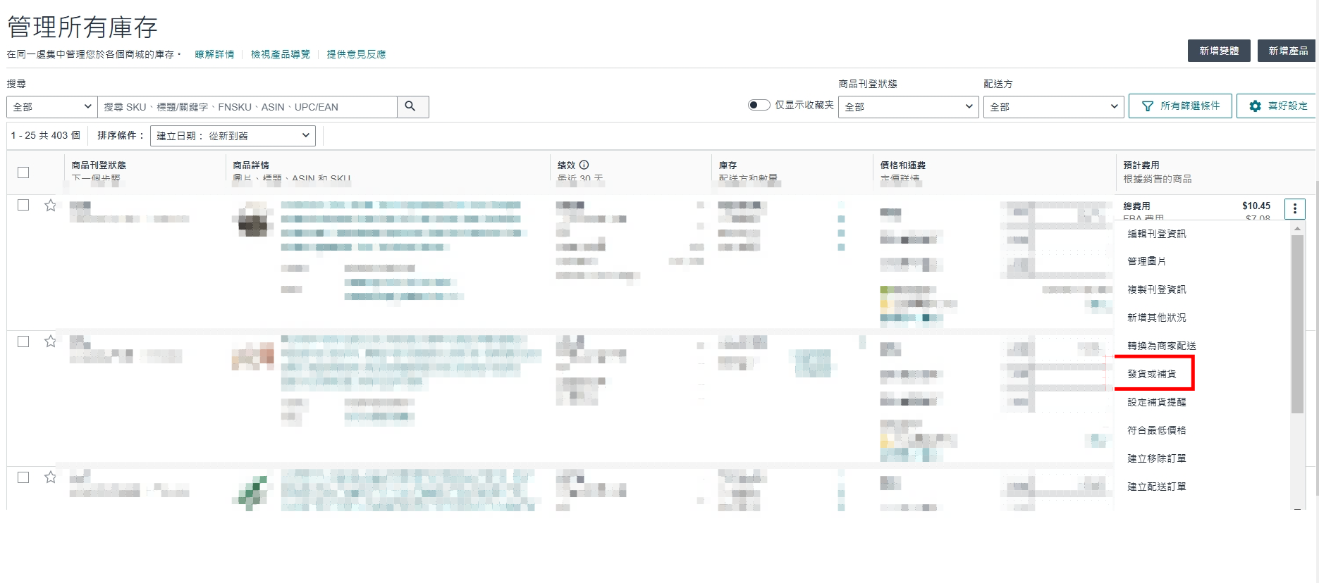 进入【库存管理】选择需发货的ASIN点击【发货或补货】开始建立计画