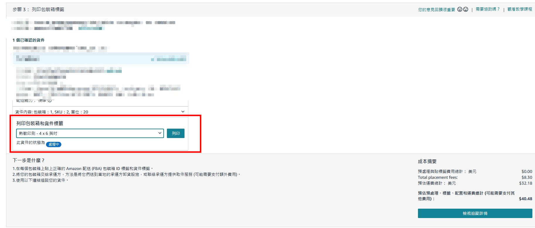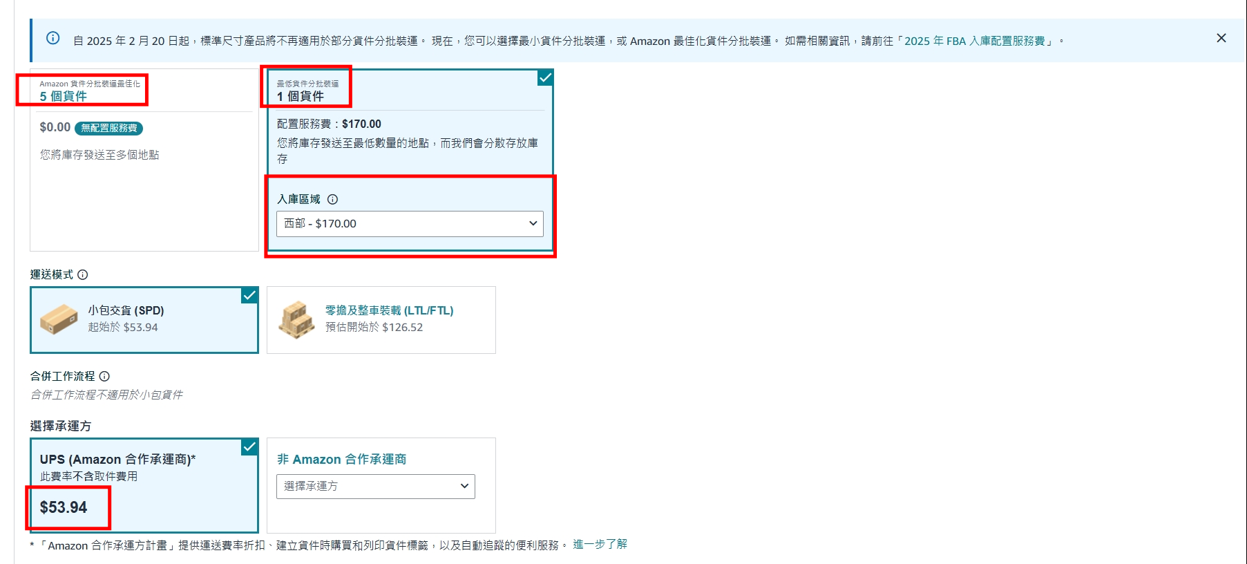 选择最小货件分批装运,或Amazon 最佳化货件分批装运最小货件分批装运: 将库存发送到最少数量(通常是单一地点) 的入库地点(需付费),可选择送到东部/中部/西部,根据送到不同的地点会有不同的费用Amazon 最佳化货件分批装运: 自行将库存运送至多个入库地点,无需付费。每件货件必须至少包含五个相同的包装箱或栈板。每个包装箱或栈板的每件商品必须有相同的数量和相同的商品组合选择承运商(亚马逊合作伙伴或自选物流)确认运费,可以选择亚马逊合作伙伴(UPS),或是如果有自己习惯配合的物流公司,也可以选择自己的承运商须注意所有的产品包装上面都需贴上亚马逊标签(FNSKU Label)