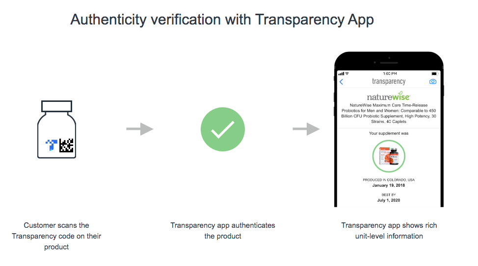 当卖家参与透明计划后,消费者只需要使用亚马逊的「透明度查看」app,扫描产品外包装上的二维码,马上就能知道产品的真实性以及从生产到销售的整个过程,消费者扫描二维条码会获得的讯息如:制造商、日期、地点、有效期等。