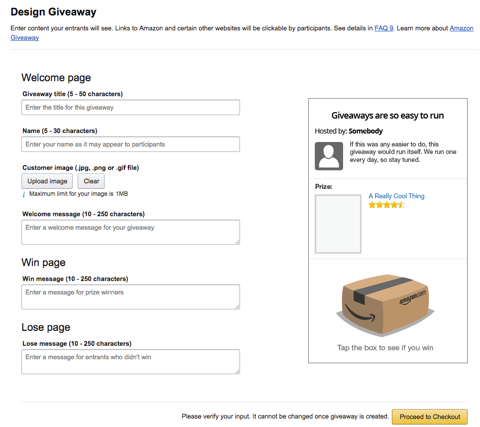 在选择 giveaway 产品和游戏规则后,接着,卖家则可打造自己的 giveaway 页面,包括赠品的标题、发送赠品的人、赠品呈现的图示,赢得或是没有赢得赠品的感谢词语,而 Amazon 则会负责寄给消费者赢得 giveaway 商品的连结。创建 Amazon Giveaway 的使用者,必须支付全额的运费和税收,在设定好 giveaway 的页面设计之后,Amazon 则会根据你挑选的产品,要使用者做进一步的线上付款。
