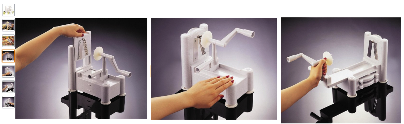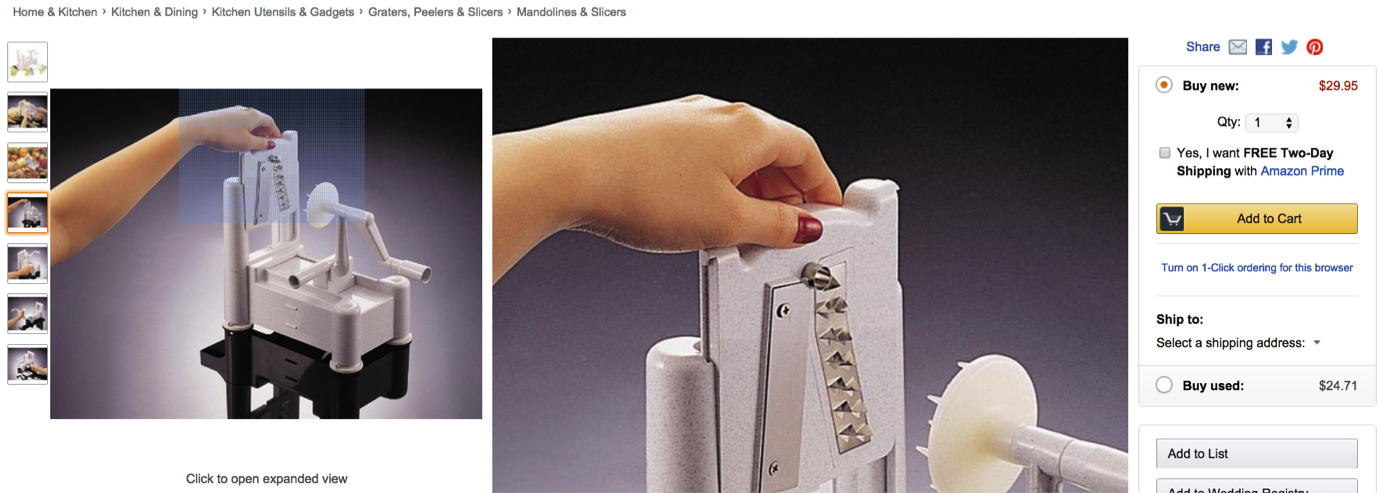 比例尺和使用实境,比方说蔬菜切片机卖家,以许多实际的照片证实产品的适用性、大小,并且解释产品的使用情况。 像此类型的商品就可以透过比较大量的照片,透过影像诉说产品故事,能够藉此为卖家带来更高的销售量。
