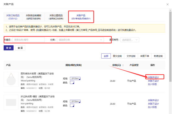 ④点击进入【关联】,选择【关联产品(设计新成品/后续设计】,选择对应的产品、对应的颜色尺寸,点击【关联并设计】,设计时可上传本地素材或者选择已上传到系统的素材