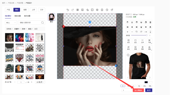上传素材后进行产品的设计,可单个设计后直接加入购物车