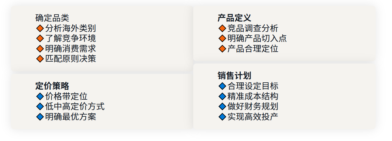 分别是:确定品类、产品定义、定价策略以及销售计划。