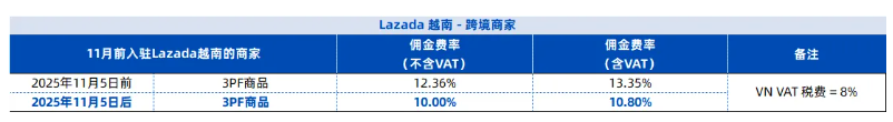 一、自2025年11月5日起,针对【2025年11月前入驻Lazada越南的商家】,成功入选且符合条件的商家,通过三方仓(3PF)发出的商品,将长期享受2.36%(不含VAT)的佣金费率减免优惠;