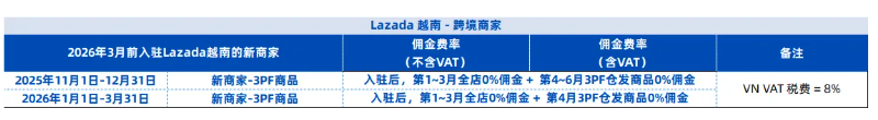 二、自2025年11月1日起,针对【2026年3月前入驻Lazada越南的新商家】,成功入选且符合条件的商家,通过三方仓(3PF)发出的商品,将享受限时免佣政策;