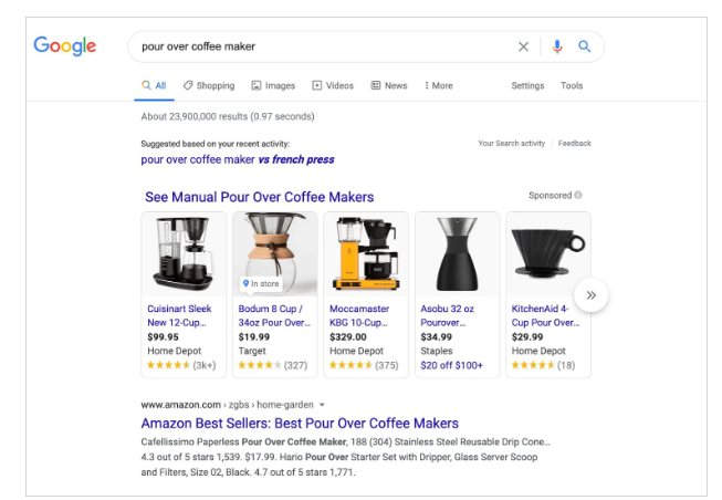 谷歌购物广告出现在搜索引擎结果页面的顶部
