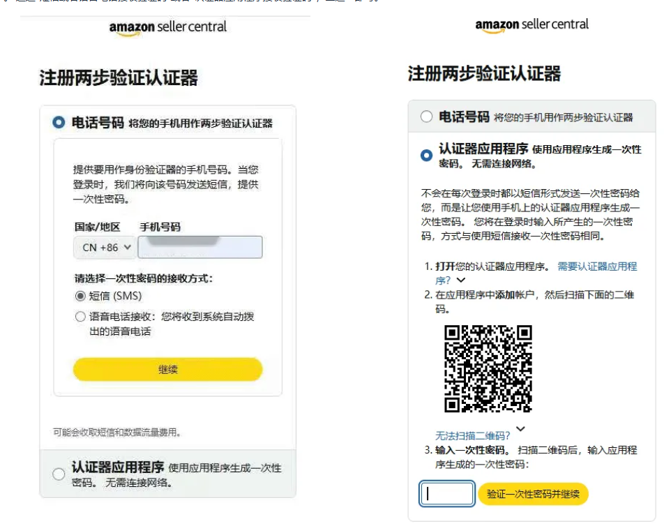 ● 接下来需要进行“两步验证”,输⼊⼀个亚⻢逊可以联系上您的⼿机号码来接收短信验证码。请在下拉框中选择您所在国家及区号(中国⼤陆的电话号码请选择“中国 +86”)。 通过“短信或者语音电话接收验证码”或者“认证器应用程序接收验证码”,二选一即可。