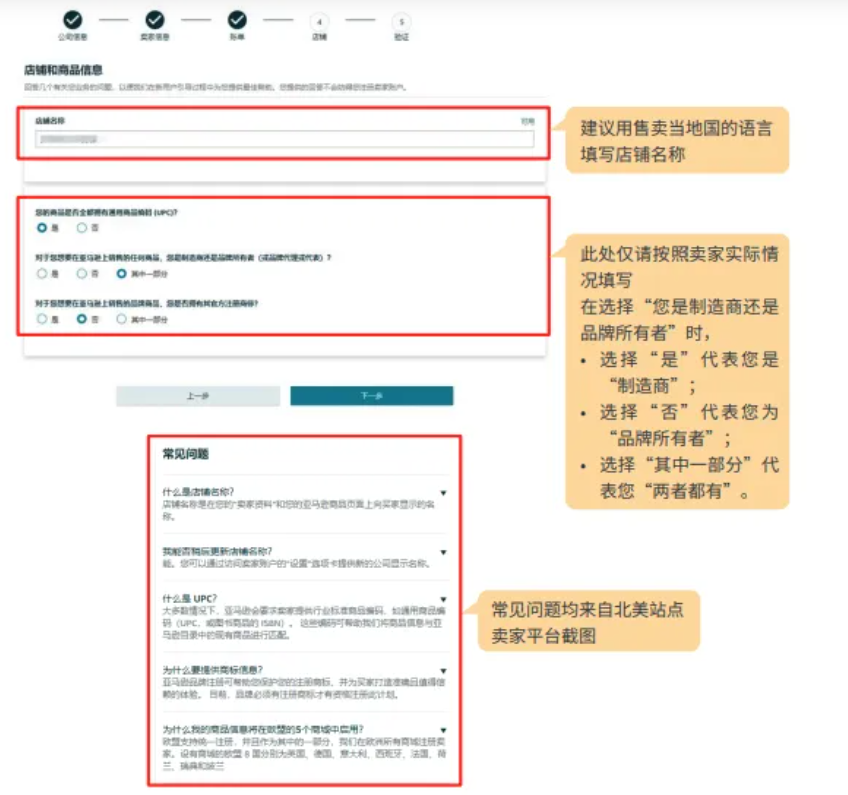 接下来填写店铺信息,包括店铺的名称以及商品编码和品牌的⼀些信息。其中店铺名称强烈建议使⽤售卖当地国的语⾔填写。