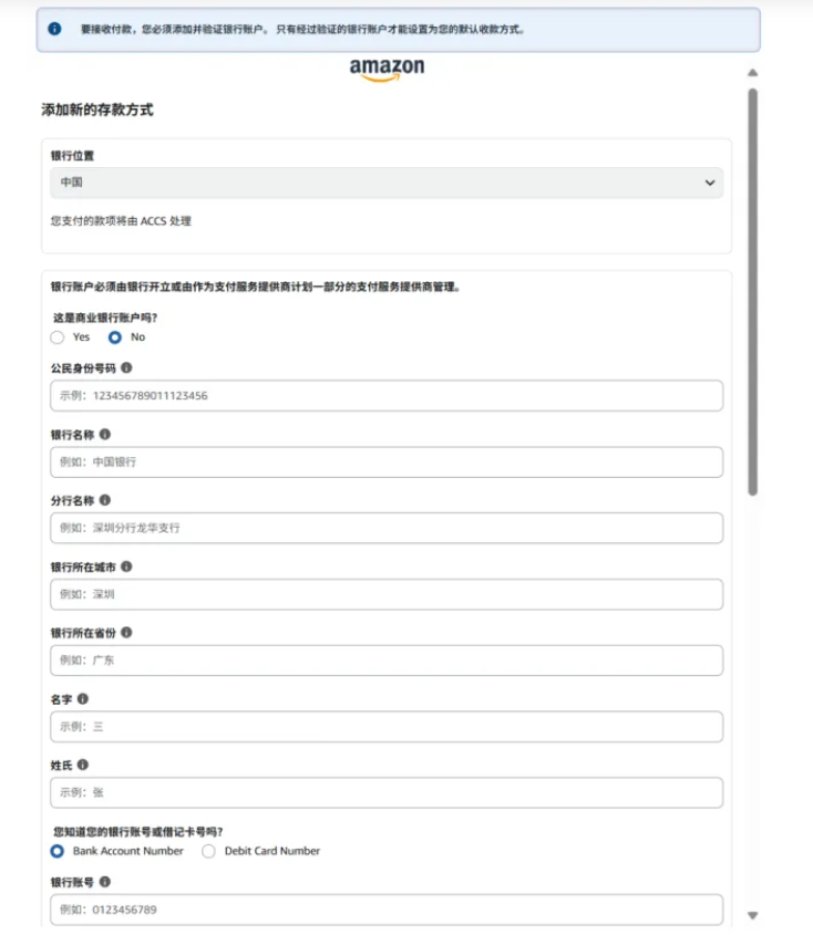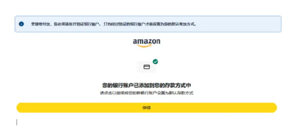 目前,亚马逊开店注册信息填写流程中新增了“填写银行账户信息”步骤,需要卖家根据页面提示,添加收款银行账户信息,并完成相应验证。该银行账户,将用于接收亚马逊的销售款项。 请注意,该银行账户需要在注册亚马逊卖家账号的法人或企业名下。