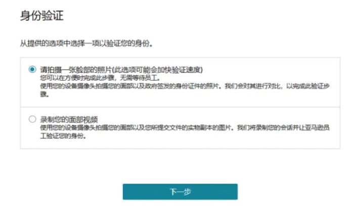 点击“继续”进入身份验证(二选一),并按指导完成身份验证。具体审核流程和注意事项,您可以点击《2025亚马逊新卖家资质审核流程及注意事项》查看。
