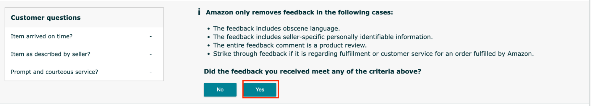 进入回馈管理程式后,选择要删除的订单和。右侧有一个下拉式选单。点击下拉式选单并选择“申请删除”。当亚马逊删除卖家回馈评级时,会出现一个弹窗显示。如果回馈违反某一原因,请按一下“是”,亚马逊将审核您删除评价的请求。