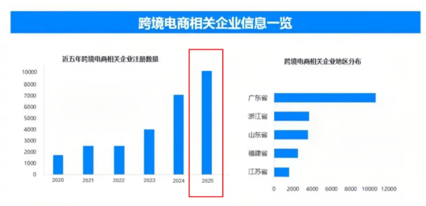 据相关数据统计,2025 年前 10 个月,我国新注册的跨境电商相关企业数量已突破 1 万家,较 2024 年同期暴涨 194.1%。要知道,2024 年全年新增的跨境电商企业也仅有 7000 多家,按照当前增速,2025 年全年新注册企业数量预计将较去年多出两倍以上,跨境电商赛道的火热程度可见一斑。