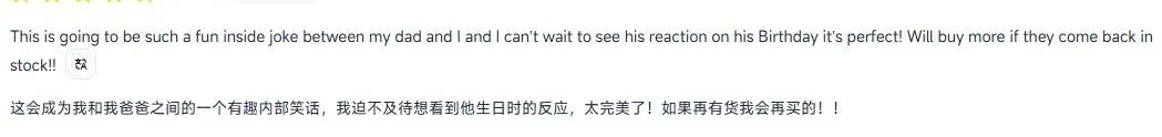 评论区早已被欢乐刷屏。有网友分享:“这太好笑了!如果你送给对的人,就去做吧。我把它送给了我 90 岁的婆婆,我们大家都笑翻了!” 还有人留言:“这会成为我和我爸爸之间的一个有趣内部笑话,我迫不及待想看到他生日时的反应,太完美了!如果再有货我会再买的!”