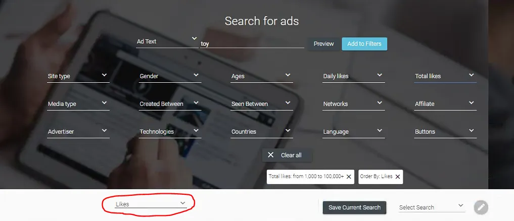 除了关键词还可以选择一个点赞数大于1000的选项,Total likes拖到1000那里,点击搜索,可以看到这个产品的广告是几号开始跑的,点赞、评论、分享,看主要跑的国家那几个国家。