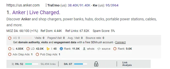 在搜索时或者网页浏览时,插件会实时显示该网站的 PA 与 DA 值,可以让你有一个初步的观感,要做这个关键词的难度有多大。