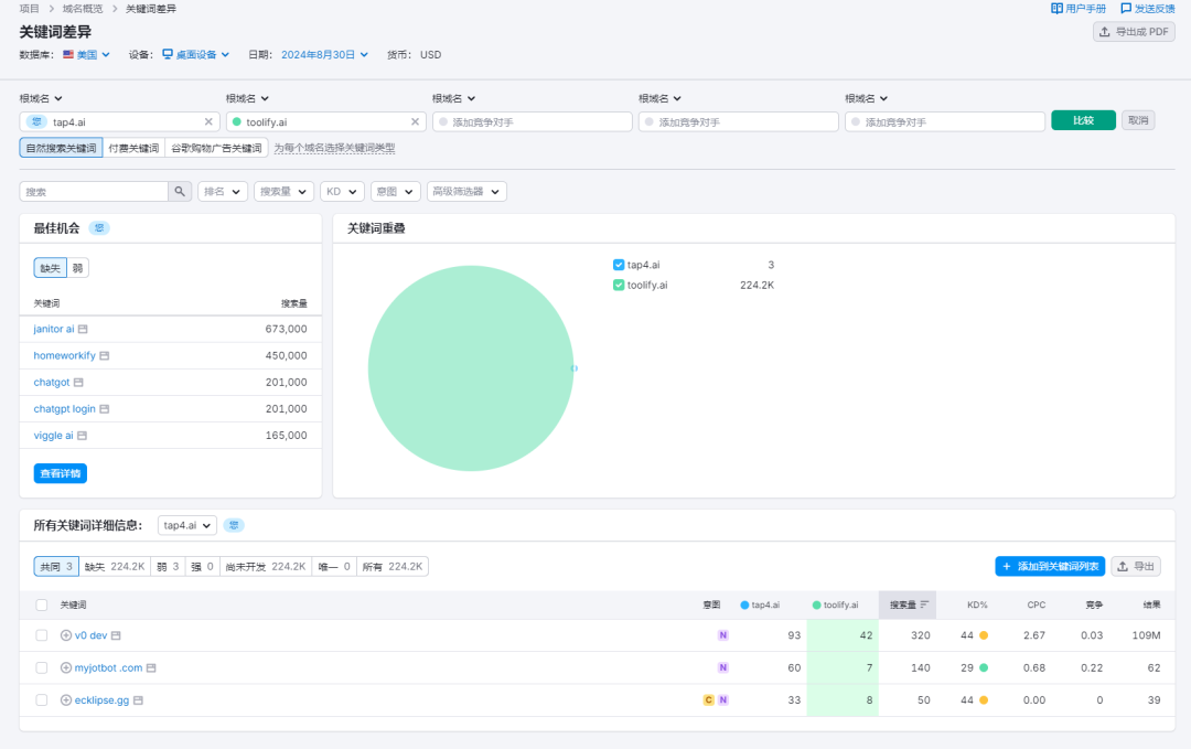 分析竞争对手的关键词策略,了解他们排名的关键词以及这些关键词的搜索量和竞争程度。使用工具如SEMrush的“Keyword Gap”找到你的网站和竞争对手之间的差距。在这里输入你的网站和一些做的好的网站,比较你们之前的差距。