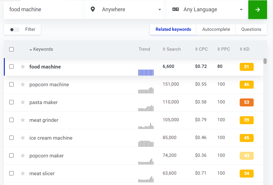 我们可以用KWFinder、Keyword tool等关键词扩充工具来进行关键词的筛选。