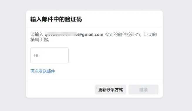 提交资料后,Facebook会向所填的邮箱发送邮件,收到的验证码填写之后点击【继续】。