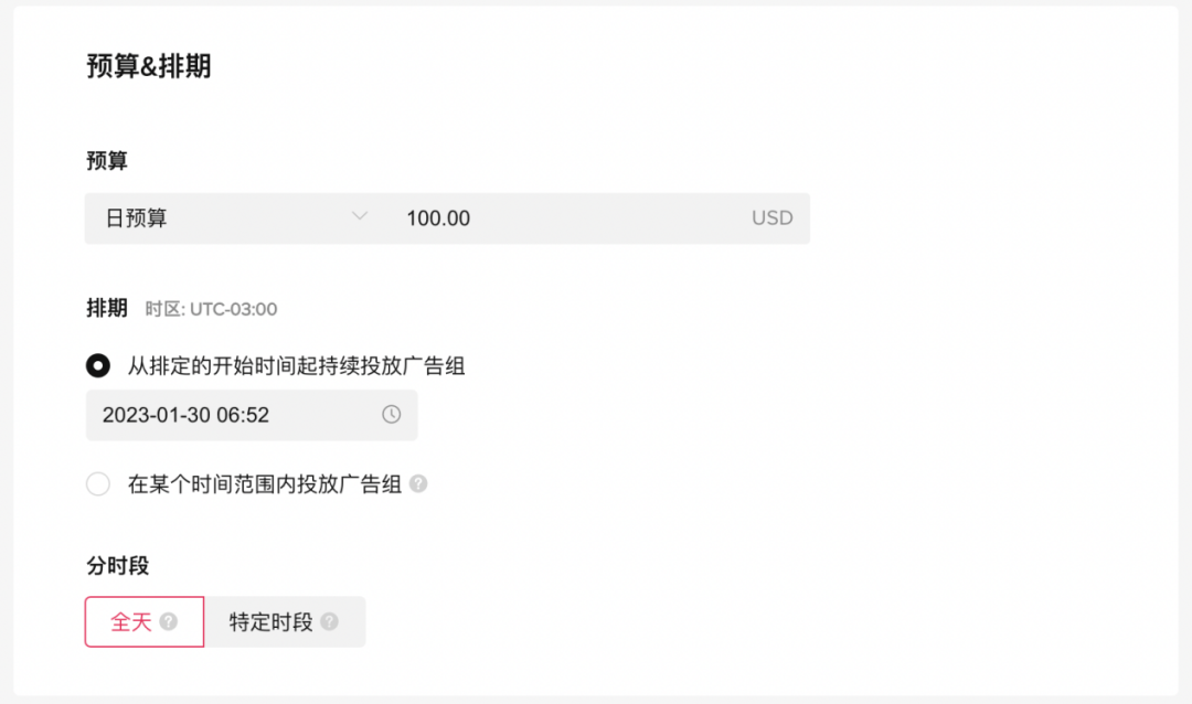 注意:广告位这里通常分开选择(这里以pangle版位为例,可以一个广告系列里面两个广告组共同测试,一个pangle,一个Tik Tok)