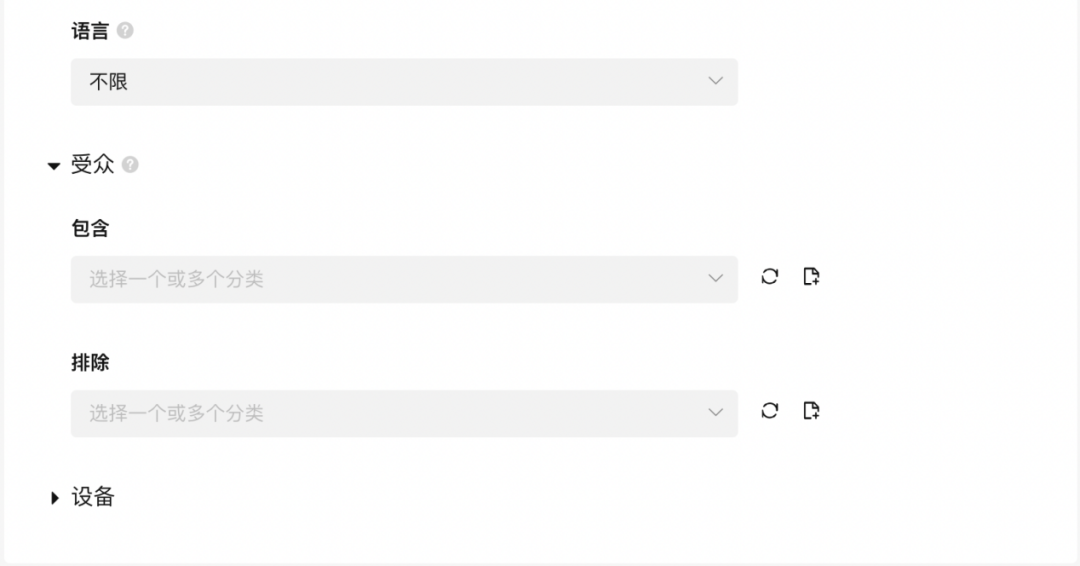 接下来,设置地区,性别,年龄,语言,受众,设备等