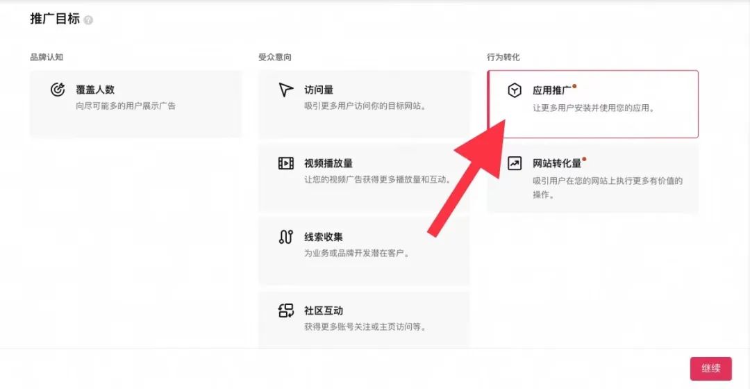 在里面可以看到,有七种广告目标可以选择,我们以付费广告为例,【选择应用推广广告目标】