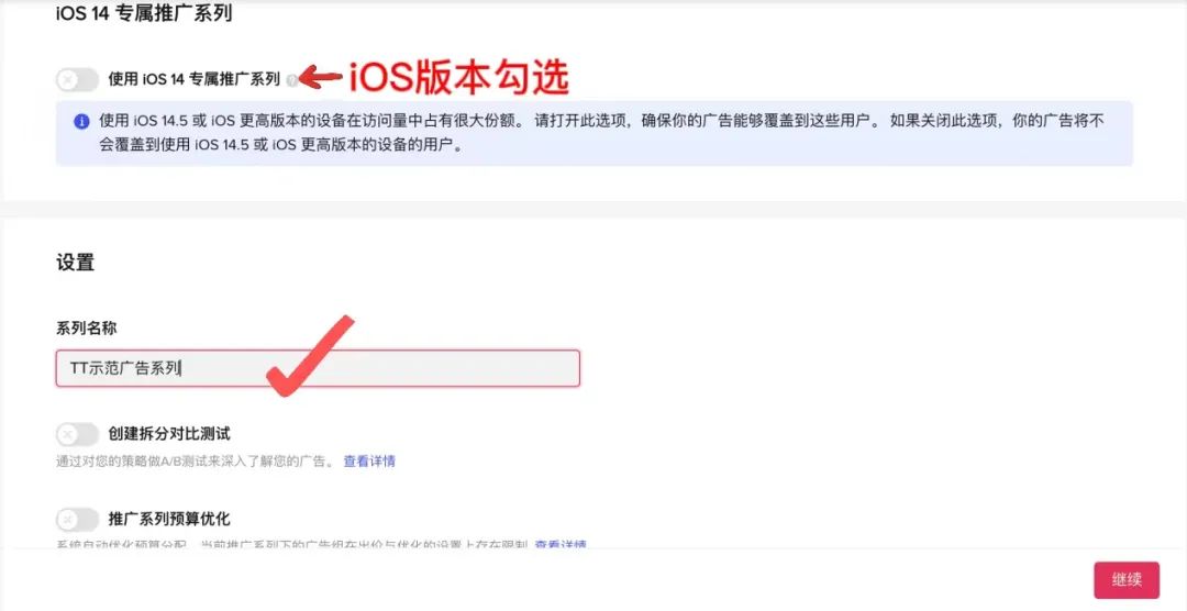 然后,我们会到达广告系列页面,这里输入系列名称(如果是投放 IOS 系列广告,需要勾选"使用 ios14 专属推广系列")