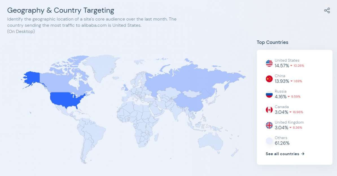 可以查看该网站的主要市场是哪里,了解市场的流量占比,我们就可以知道该从哪些地方发力了。
