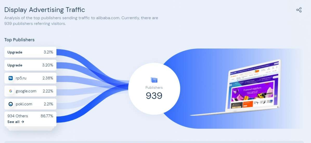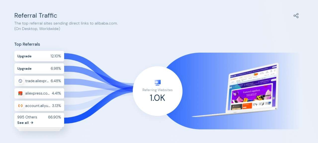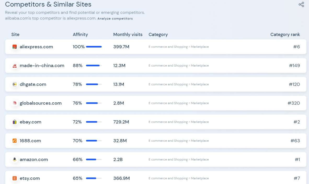 这个部分可以查看10个竞争对手分别是谁,我们可以看到阿里巴巴的竞争对手有速卖通Aliexpress,中国制造Made-in-China;DHgate, 全球资源Globalsources等等B2B网站平台。这部分可以帮卖家快速确定竞争对手,以便我们和同行相比能够及时查漏补缺。
