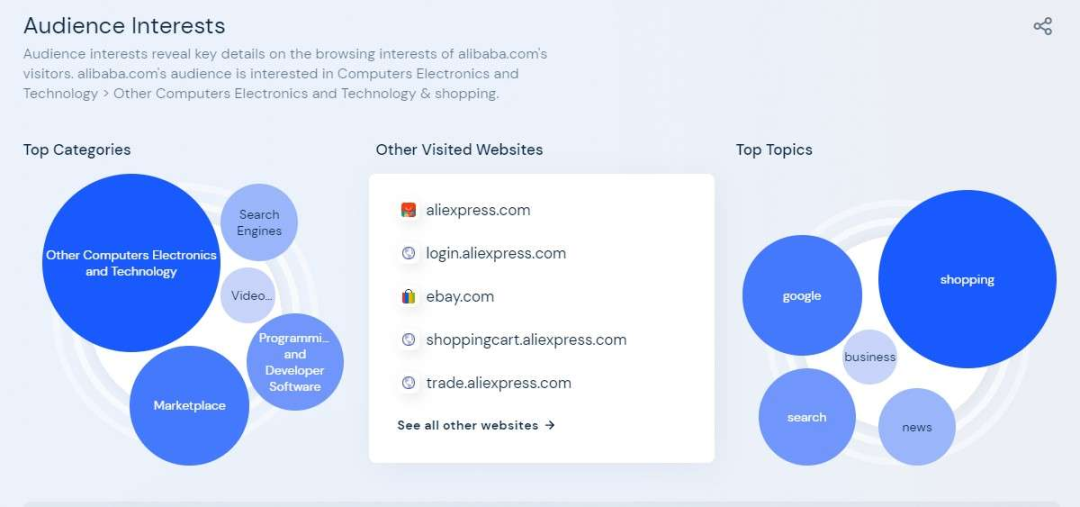 查看网站的用户受众感兴趣的话题(仅供参考),类目(仅供参考),以及用户访问的其他相似网站。