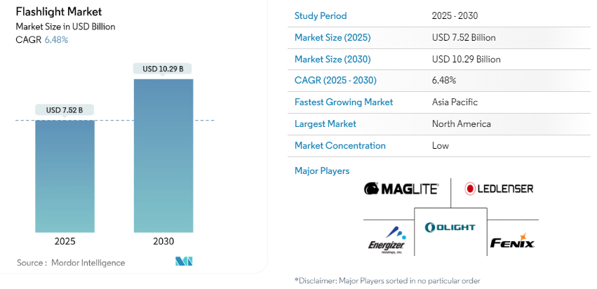 从全球视角来看,这个市场的潜力更加可观。市场研究机构Mordor Intelligence的报告显示,2025年全球手电筒市场价值预计为75.2亿美元,预计到2030年将增长至102.9亿美元,复合年增长率为6.48%。其中,北美市场贡献最大份额,亚太市场增速最快。