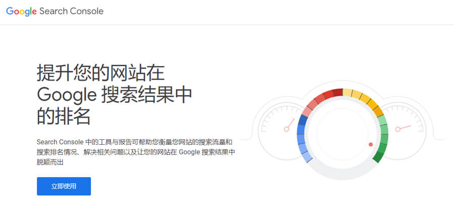 先打开GSC官方网站(https://search.google.com/search-console),点一下「立即使用」这个按钮。登录时要用谷歌账号,要是还没有的话可以当场注册一个。