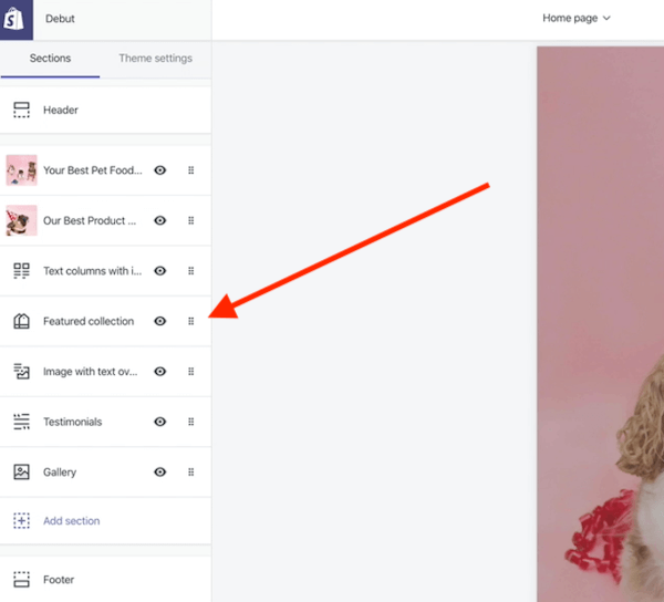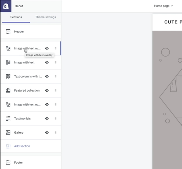 这时我们就可以对页面上的内容,比如文字、图片进行修改了。Shopify把整个网页定义成了各种各样的模块,页面里的内容和布局都是靠这一个个模块来实现的。