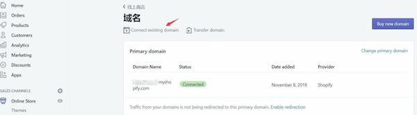 要让用户方便记住你的网店,你需要有自己的域名,而不能继续使用Shopify提供的默认二级域名。在后台界面,找到“Add domain”:
