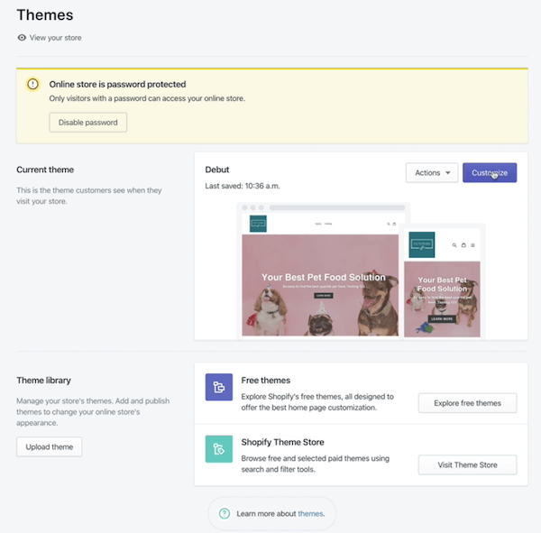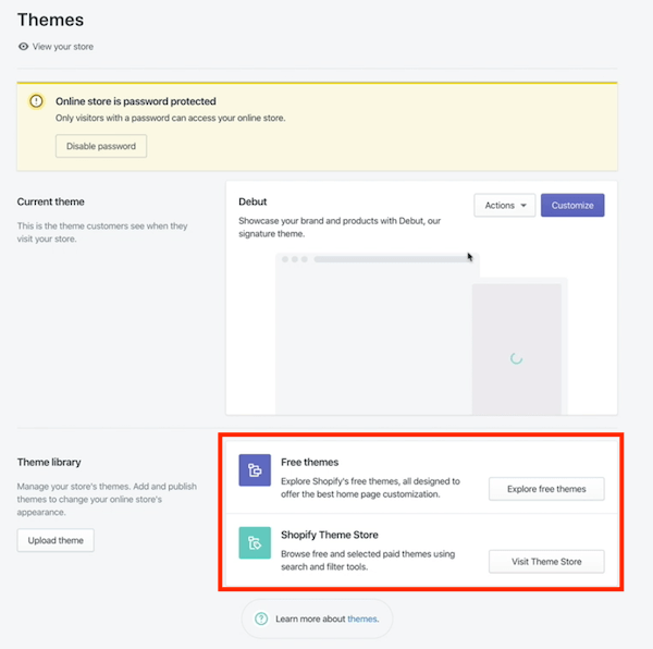 然后,我们可以看到网店目前使用的主题(默认的初始主题),你可以根据自身需要查看更多免费的主题或者到主题商城Theme Store里挑选合适的付费主题: