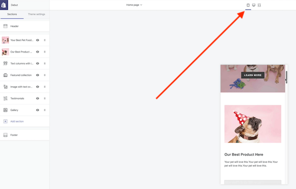 Shopify网店程序是响应式的,我们可以通过点击栏目上方的手机标志查看网站在移动端的样子: