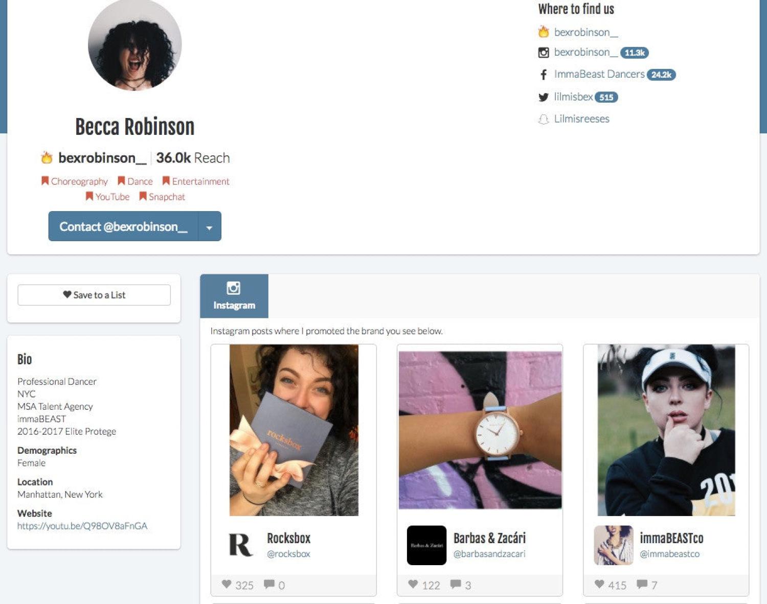 网红个人资料中包含他们与品牌合作的内容库,以及他们建立受众的所有渠道。