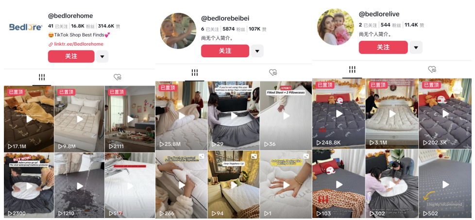 Bedlore还在积极打造达人矩阵。除了品牌号@bedlorehome,还运营多个以bedlore为前缀的个人账号。虽然这些账号视频不是每条都能爆,但偶尔一条百万、千万级播放的视频,也能带来数万乃至十几万美元销售额,既扩大品牌声量,又创造可观收益。