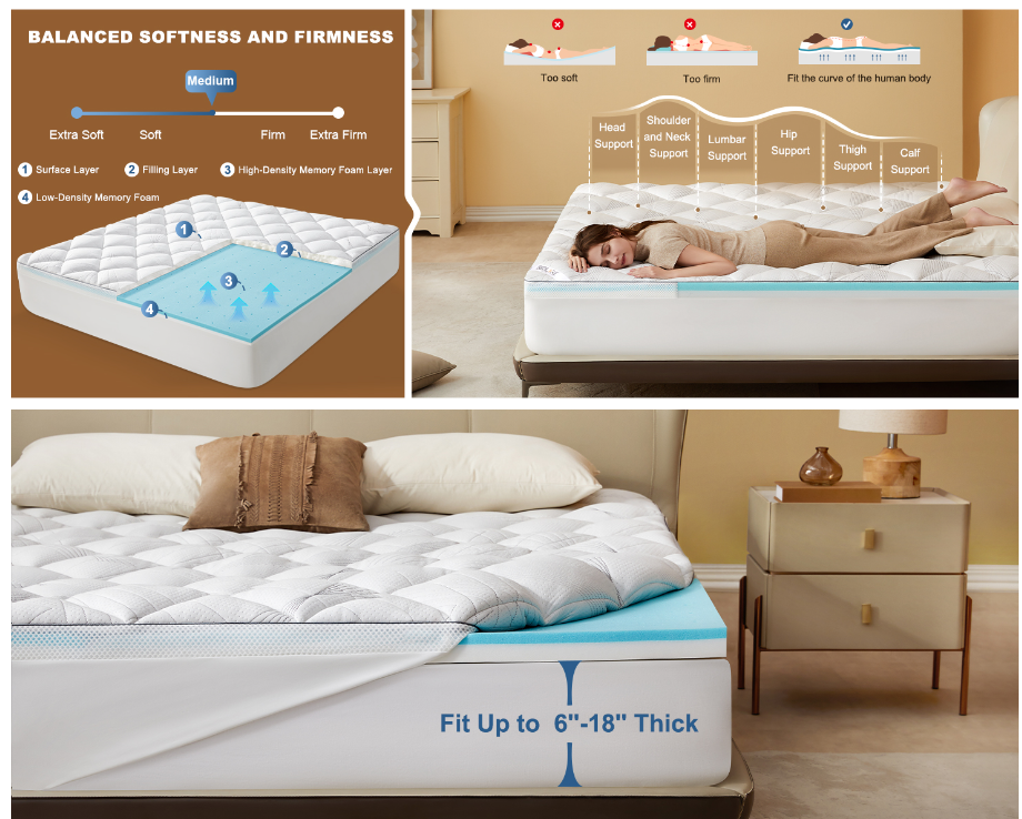产品功能也相当聚焦。床垫垫层的核心卖点是支撑性,宣传能贴合身体曲线、缓解疼痛;作为延伸设计,垫层采用深口袋结构,直接套在床垫上,不易移位。