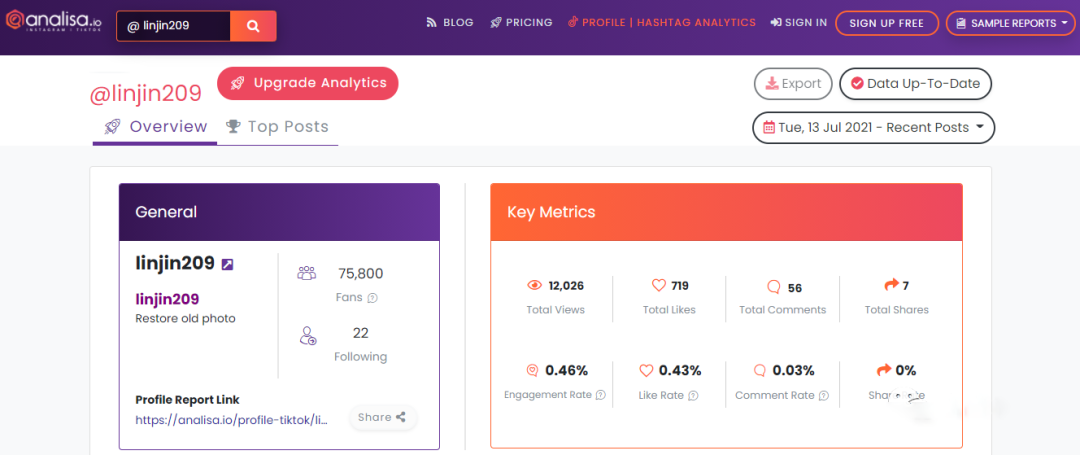 这是一款免费工具,可以分析个人资料、主题标签和趋势。